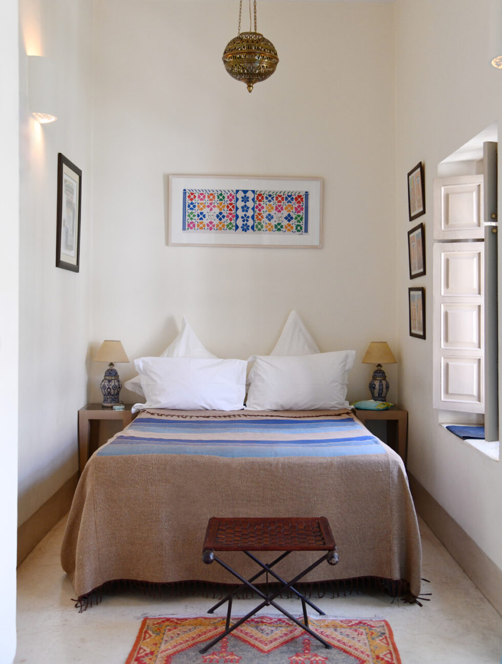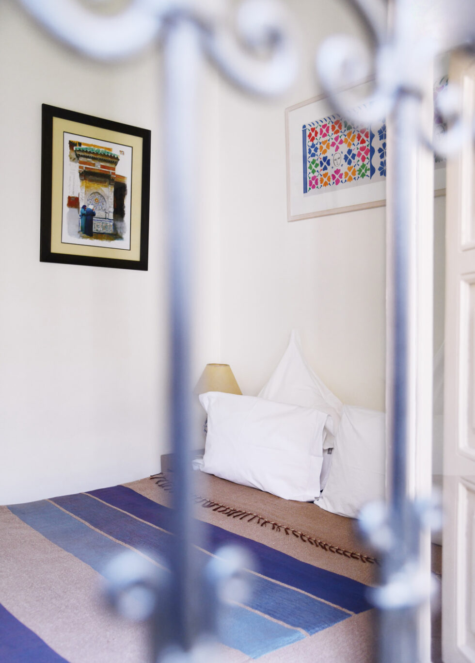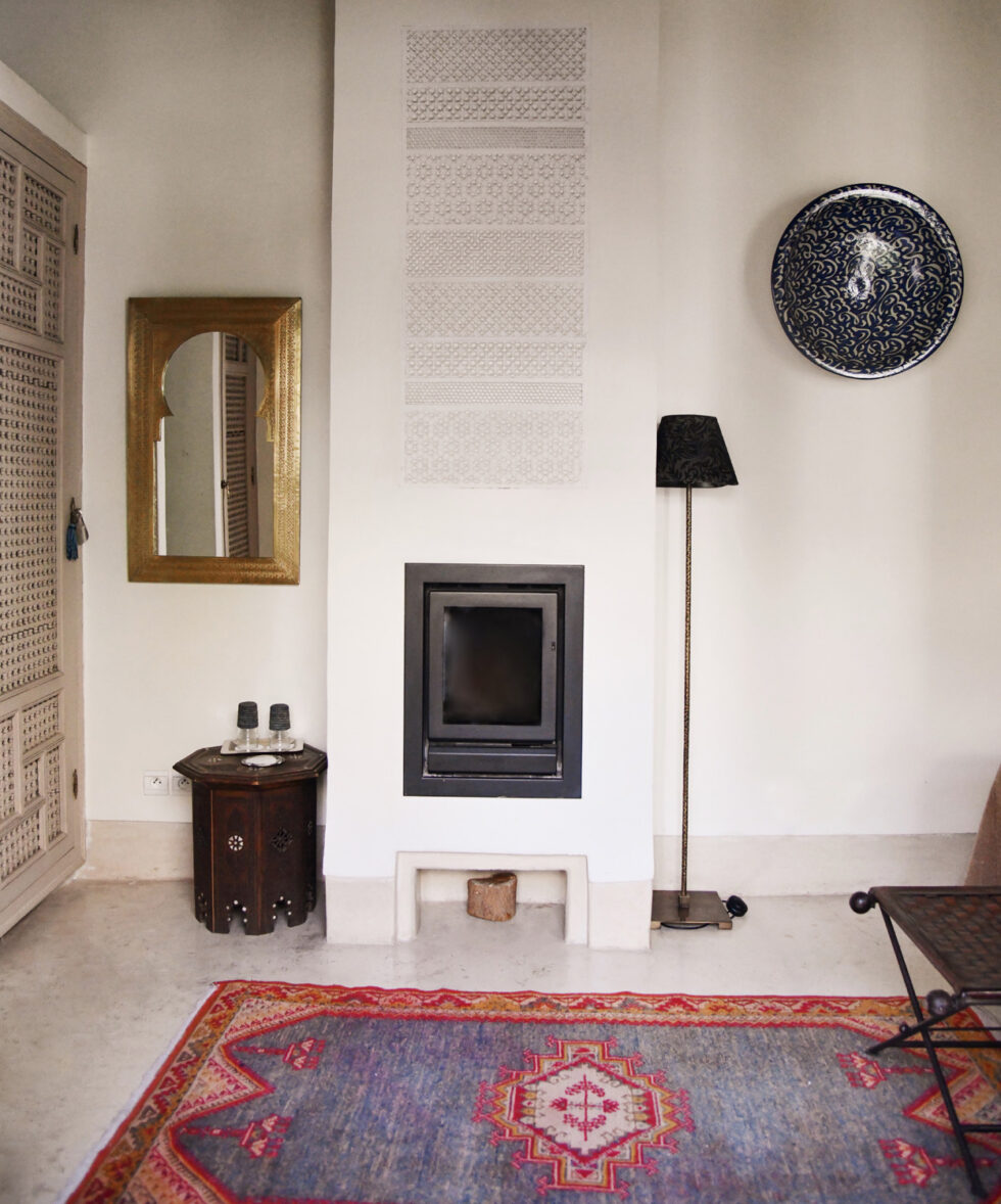 All bedrooms are on the upper floors, have individual air-conditioning, and are accessible through a shared balcony providing a space to relax and enjoy drinks. All rooms have stylish fireplaces, some are made more efficient with inset wood stoves to help cope with the winter nights which can be chilly in Marrakech. All rooms have adjustable lighting that can be either romantic or practical.